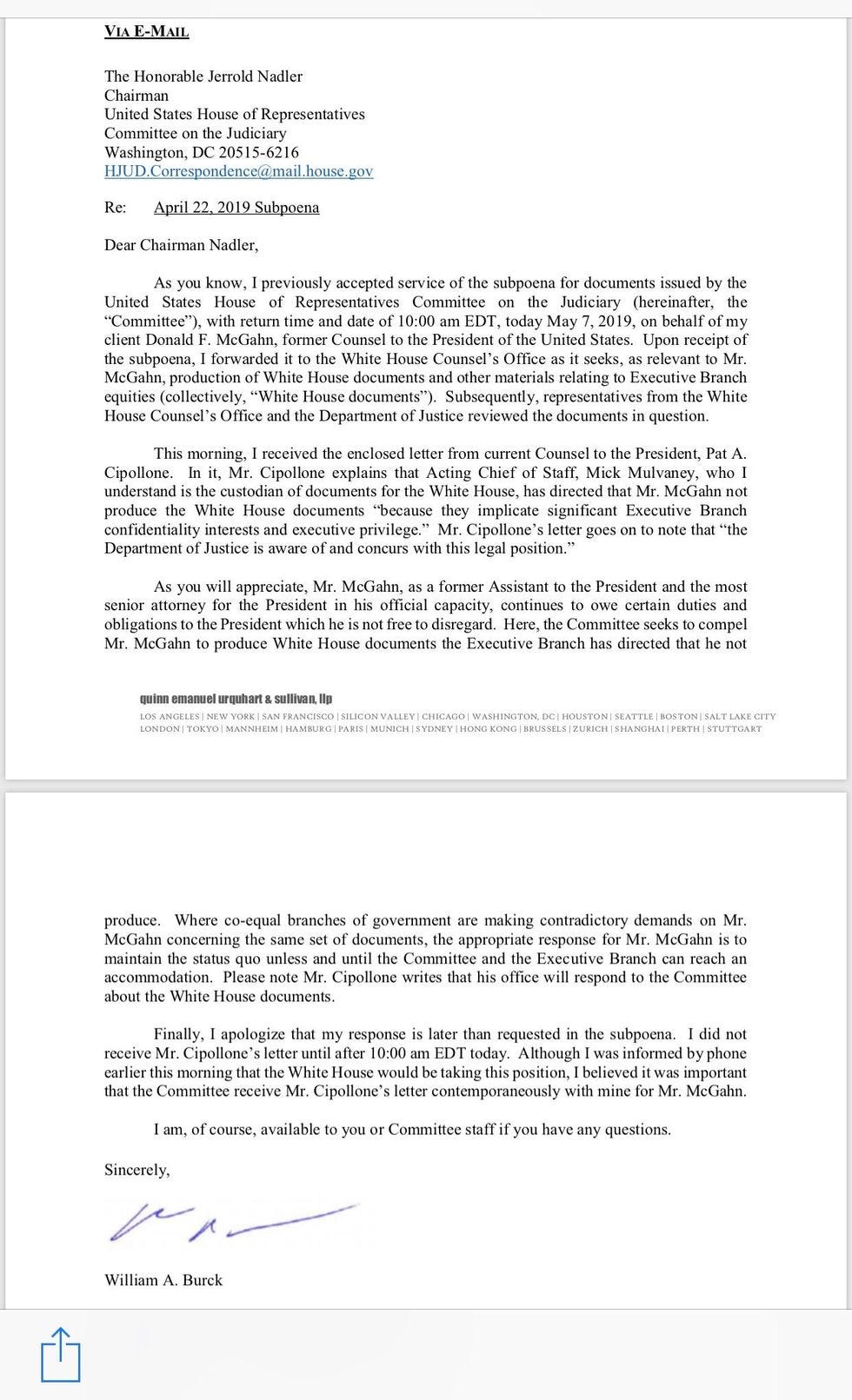 Here's the letter from McGahn lawyer Bill Burck to Jerry Nadler:
