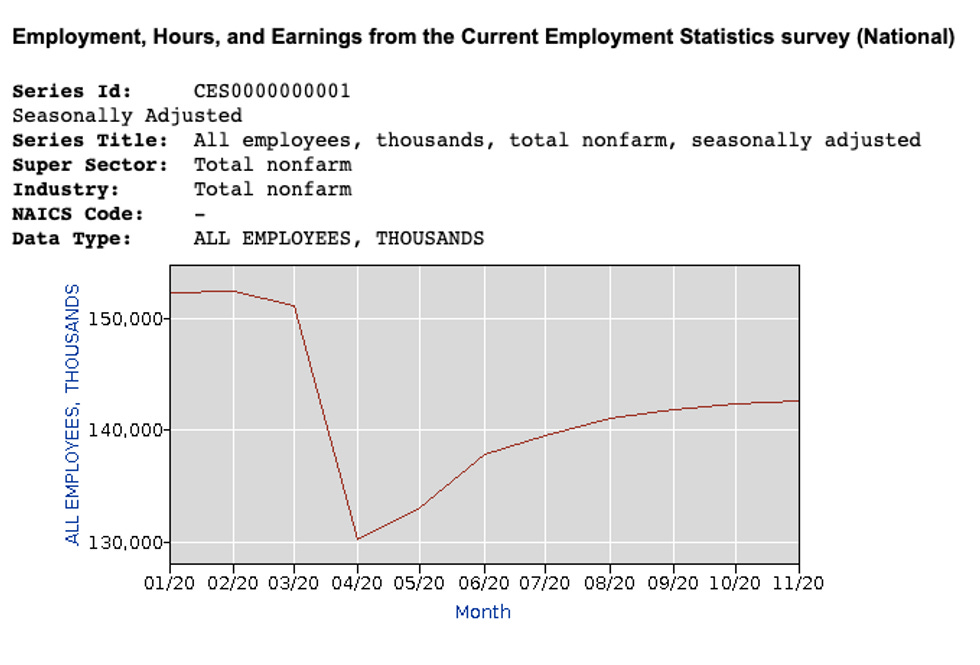 So much for that V-shaped recovery. The November jobs report is out this morning, and it's not great! Economists were looking for 445,000 new jobs, and they got 245,000. That's compared to a gain of 610,000 jobs in October. Hey, remember when Kush 'n' Munch promised us a soaring year-end recovery thanks to the Dear Leader's wise stewardship? Yeah, not so much.