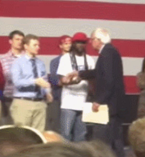So instead, let's go to our Safe Space, hug a fluffy bunny, and watch a couple VERY BRIEF little videolets of Hillary Clinton and Bernie Sanders being adorable, hanging out with people of color, and not voting for the Crime Bill or calling people "superpredators" or being married to Bill Clinton EVEN ONCE.