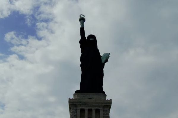 Yes, and there's a woman in a burqa. The great Christian cathedrals will, again, become mosques full of scary Muslims praying, blah blah blah. It's pretty lazy.