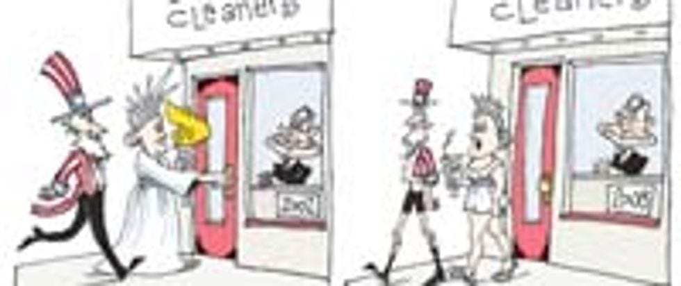 "Don't worry," the perverts told our old, humiliated Uncle, "these pictures will remain totally private. You have our word of honor." Naturally they were on the Internet (at http: //www.hotnakedunclesam.com) within minutes. Because we live in an historical moment when an upsurge of political idealism coexists with the usual unspeakable depravity, this gave rise to a whole new trend: "sexy" patriotic costumes! Here we can see a couple of hot young people with loose morals, energized by Obama's victory, getting their Inauguration Ball outfits ready: sexy Lady Liberty and sexy Uncle Sam! They will make out during the Inaugural Address, but still freeze to death, because sexy outfits are not warm enough.