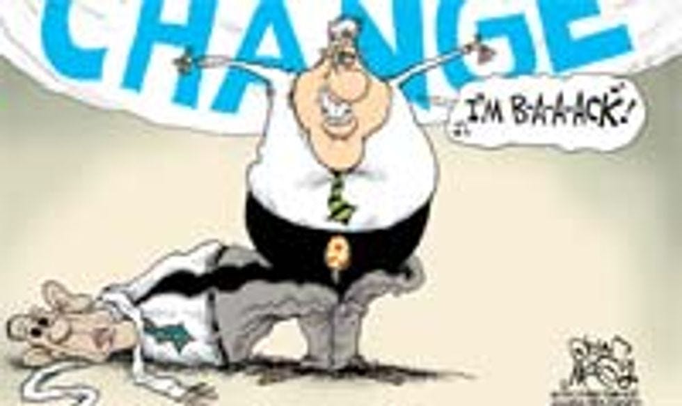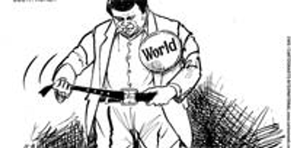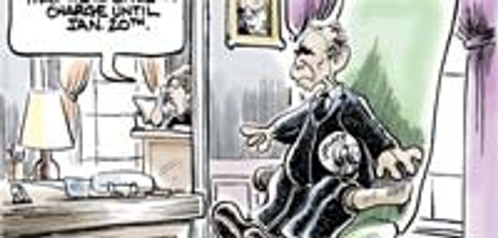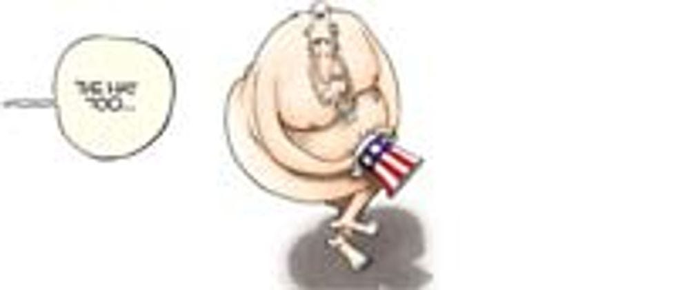With this rash of nudity afoot, some folks had a sudden and horrifying idea. "Oh my God," they thought, "what ifGeorge W. Bushis naked?" They rushed to the White House to make sure to nip any such move towards presidential nudity in the bud. What they found was a sort of good news/bad news situation: the figure in the chair behind the Oval Office desk was in fact still fully clothed, but upon closer inspection it actually turned out to be not a live presidential person at all, but rather some kind of inflatable sex doll. Presumably Bush left the inflat-o-Bush behind as a decoy when he fled south to Paraguay.