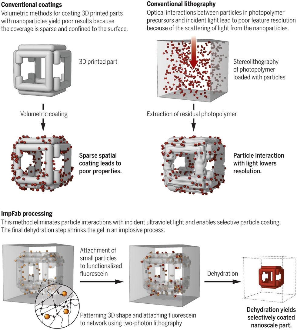 That's the next step. Add the desired molecules to the right locations, and then shrink the entire structure by adding an acid. The acid blocks the negative charges in the absorbent gel so they no longer repel each other. This causes the gel and therefore the whole structure to contract. Using this technique, science peeps can shrink the objects they assemble 10-fold in each dimension. Three dimensions, so 10-fold times three means you can shrink something to 1/1000th its original size. This ability to shrink not only allows for increased resolution, but also makes it possible to assemble materials in a low-density scaffold. This enables easy access for modification, and later the material becomes a dense solid when it is shrunk.