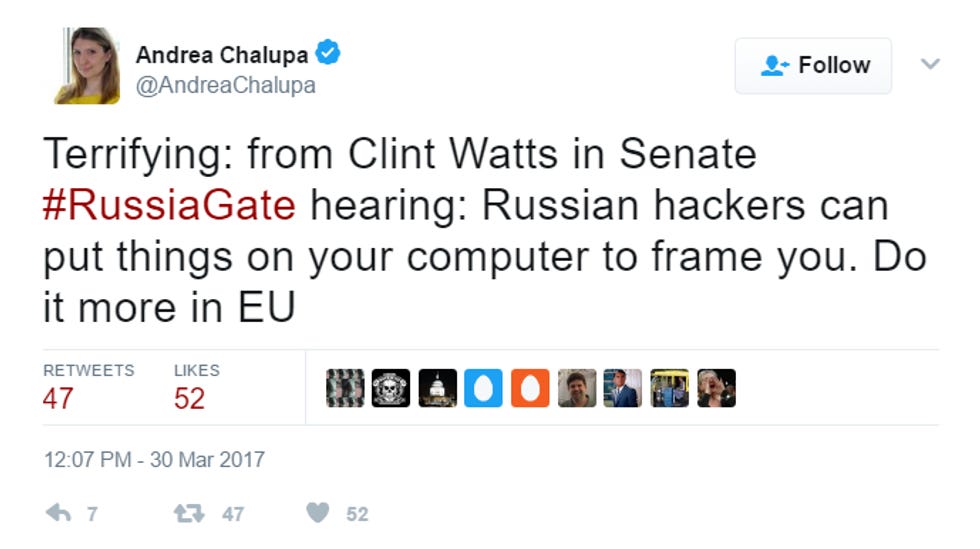 10: 47:Right now it is just a bunch of so-called "experts" saying "information" about how Russia's hacking and meddling isn't just an American operation, and it's been going on for a looooooooong time. Also a guy named Clinton Watts just pronounced the word "spectrum" like "spRECTUM." It was not the finest pronunciation moment in Senate hearings.