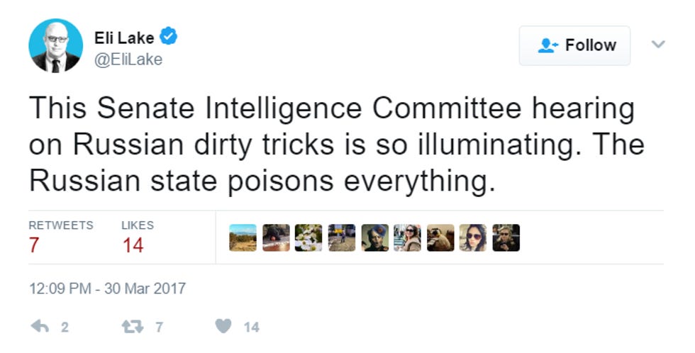 Oh hi there, are you watching the Senate Intelligence Committee hearing we told you about yesterday, on Russian interference in the 2016 election and whether the Trump campaign actively colluded with the Russians? We are! It already started ... so YOU'RE LATE! But you didn't miss much. Basically they did their opening statements, and Democratic committee vice chair Mark Warner has been subtweeting the everliving BALLS out of Devin Nunes, emphasizing that over here in the grown-up Senate, where the grown-ups live, they will be doing a serious, bipartisan investigation, which is very different from the House Intelligence Committee investigation, which is basically Nunes flicking poo everywhere and trying to protect his real dad Donald Trump.
