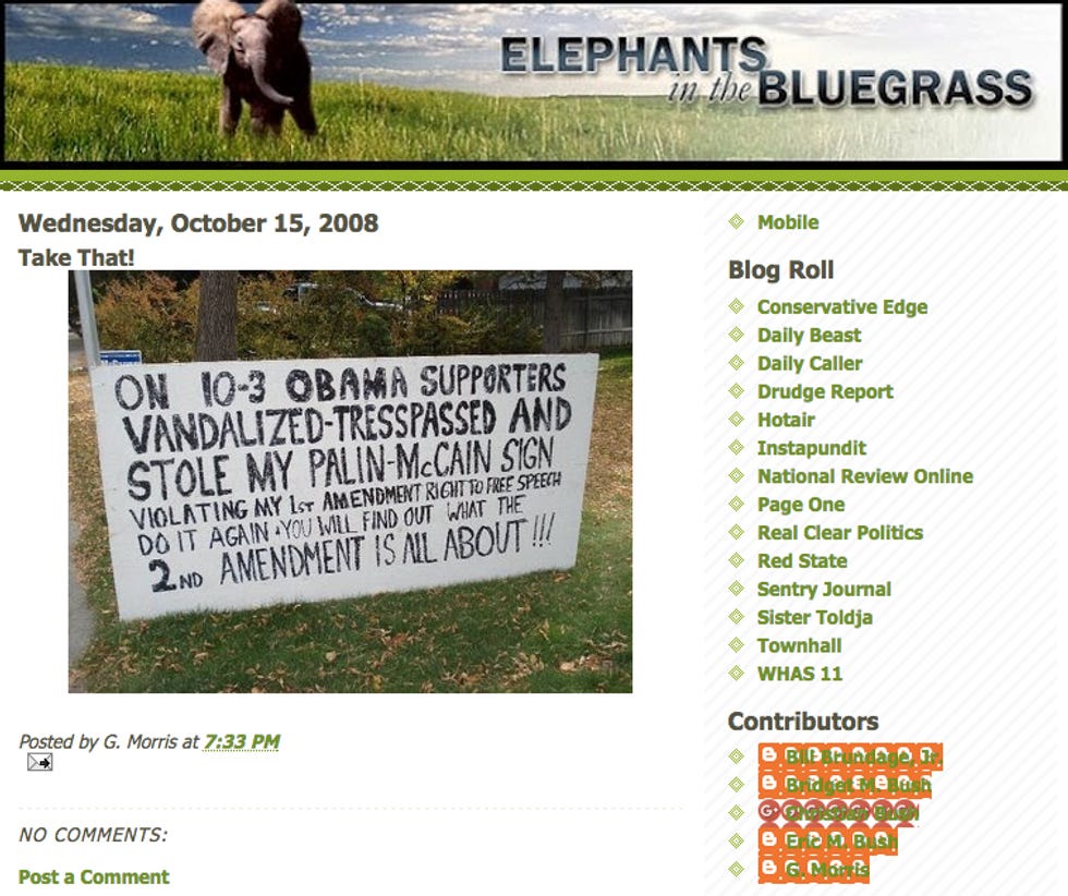 We don't blame Bush for his wife Bridget's batshit crazy blog Elephants in the Bluegrass.Yes, a woman who graduated from Harvard law actually typed this sentence on Monday: "That means Paul -- a sitting U.S. Senator -- was spyed [sic] upon by the executive branch probably by the NSA." But whatever. The issue is that John Bush also typed a whole bunch of crazy sentences of his own under the pseudonym "G. Morris."