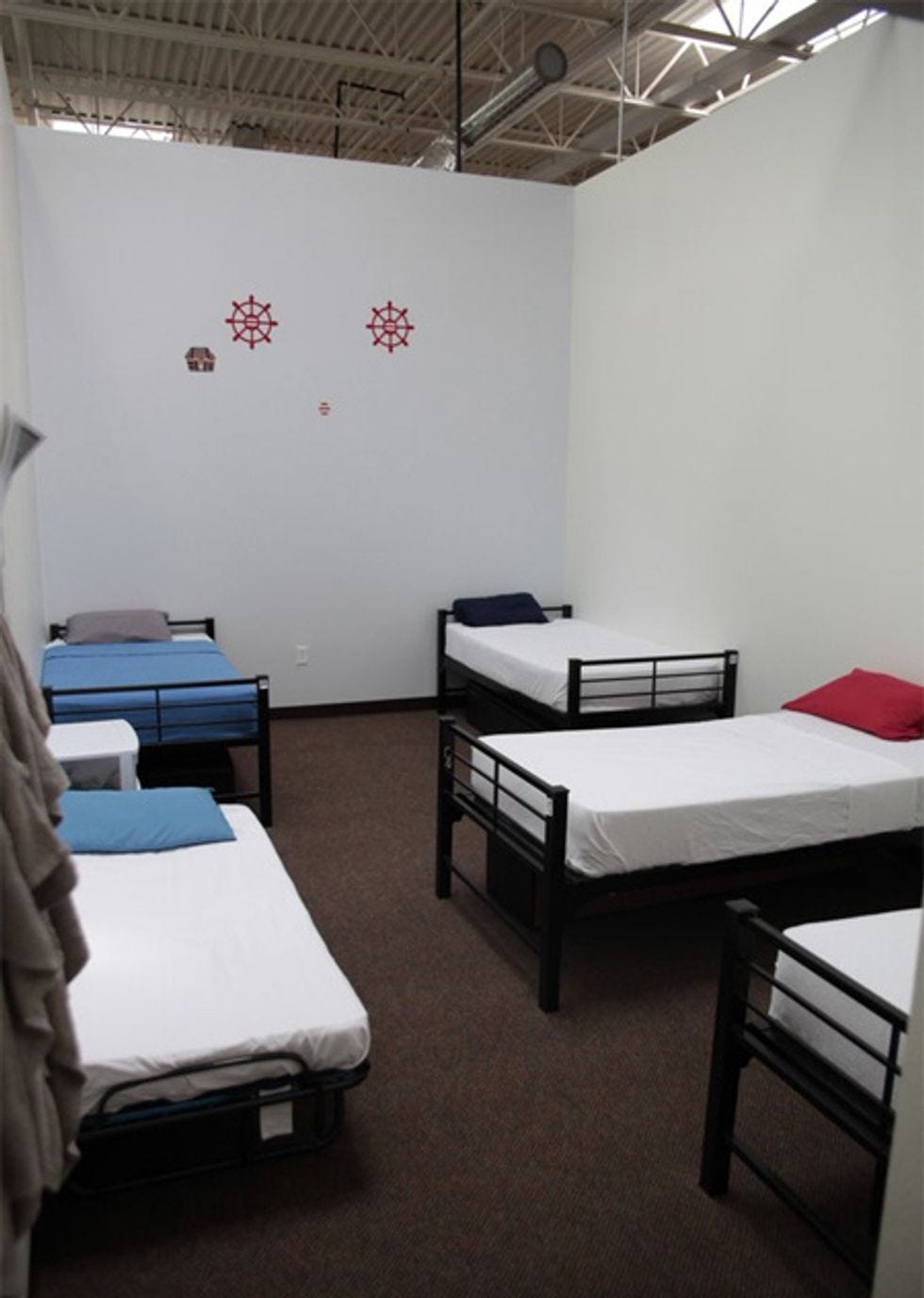 Inside the building, the former Walmart has been partitioned off into rooms, with a cafeteria, classrooms, and bedrooms that used to sleep four boys each; now, with the addition of a cot, they hold five: