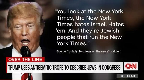 Trump was accused of using “anti-semitic tropes,” but a trope is a figure of speech or rhetorical device that’s overdone. The “trapped in an elevator” sitcom plot is a trope. Claiming Israel was the unseen puppet master behind Congress is straight-up anti-semitism. Trump also dusted off the racist chestnut about Jews controlling the media. He said the New York Times “hates” Israel, which doesn’t compute for him because the paper’s publishers are Jewish (we’ll get to that later).