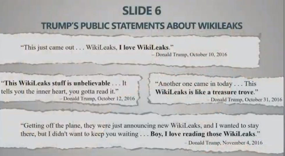 Quigley then showed this slide of Trump quotes about WikiLeaks and asked Mueller to react: