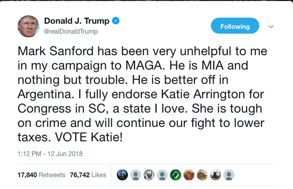 OK, two things: Holy Crap! And who the hell is this guy? Joe Cunningham flipped a district Trump carried by 11 points in 2016. Republicans have held this seat since 1981, basically for as long as there's been Millennials. You'll recall that Trump supported primary challenger Katie Arrington over incumbent Mark Sanford, the former South Carolina governor who dared upset Trump's fragile ego with the occasional milquetoast criticism. Trump rightly assumed Arrington would prove a reliable stooge in Congress. The one flaw in his plan was that she had to, you know, win. In fairness to the orange meanie, FiveThirtyEight's forecast for Cunningham's chances was basically a 1 in 10, "laugh-in-your-face, you'll see DC on vacation" long shot.