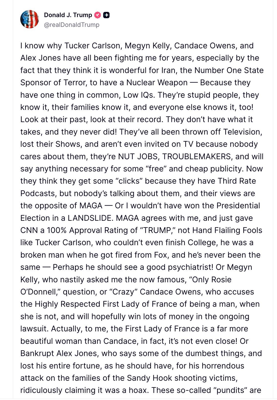 I know why Tucker Carlson, Megyn Kelly, Candace Owens, and Alex Jones have all been fighting me for years, especially by the fact that they think it is wonderful for Iran, the Number One State Sponsor of Terror, to have a Nuclear Weapon — Because they have one thing in common, Low IQs.