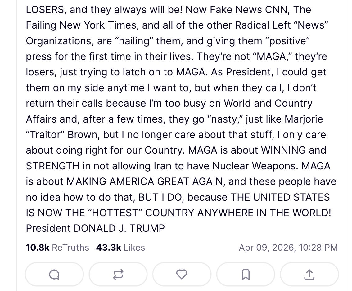 You don’t under any circumstances have to hand it to Donald Trump, but he lashed out last night at a bunch of the erstwhile MAGA creatures who are (correctly) making fun of his giant fucking murder failure in Iran, and oh boy, it was hilarious. Moreover, we are going to have to agree with Trump on some of these counts!