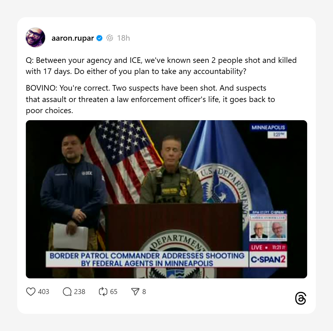 Oh, Pretti was a "suspect," huh? So they're going to do ex post facto criminal designation now. Dang, they're really whipping out the usual toolbox they use when cops extrajudicially execute Black people.