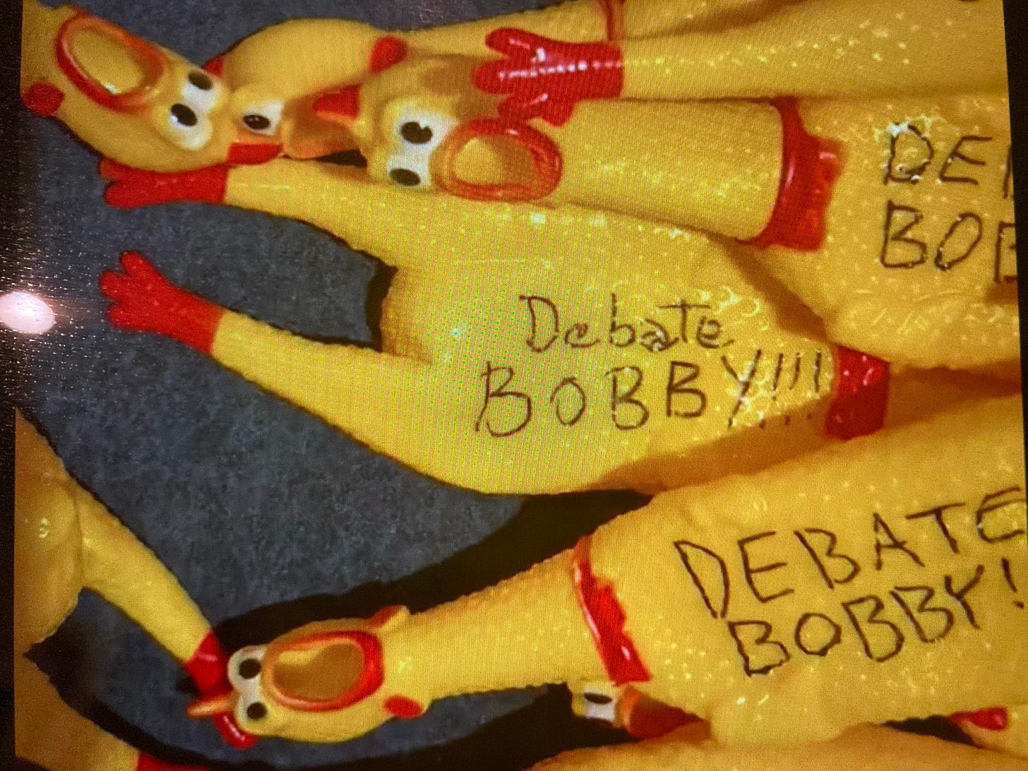 Other Libertarians were further disgruntled when Trump refused to debate RFK Jr. and the Ratatouille-like brain worm that controls him. After Bobby’s speech Friday night, some witty Wanda handed out squeaky rubber chickens with “DEBATE BOBBY” written on them to squeeze at Trump. Then Trump’s Secret Service detail authoritarianily confiscated the chickens, and also reportedly cleared the best seating for Trump’s security and his loyalists, pissing off the party of you’re not the boss of me, mom! even more.
