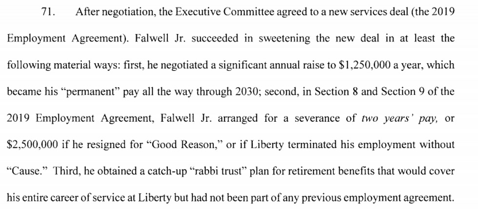 And according to the suit, Falwell tried to couch the new severance provisions as an advantage to the school, which might feel the need to cut ties with him because of his association with President Trump.