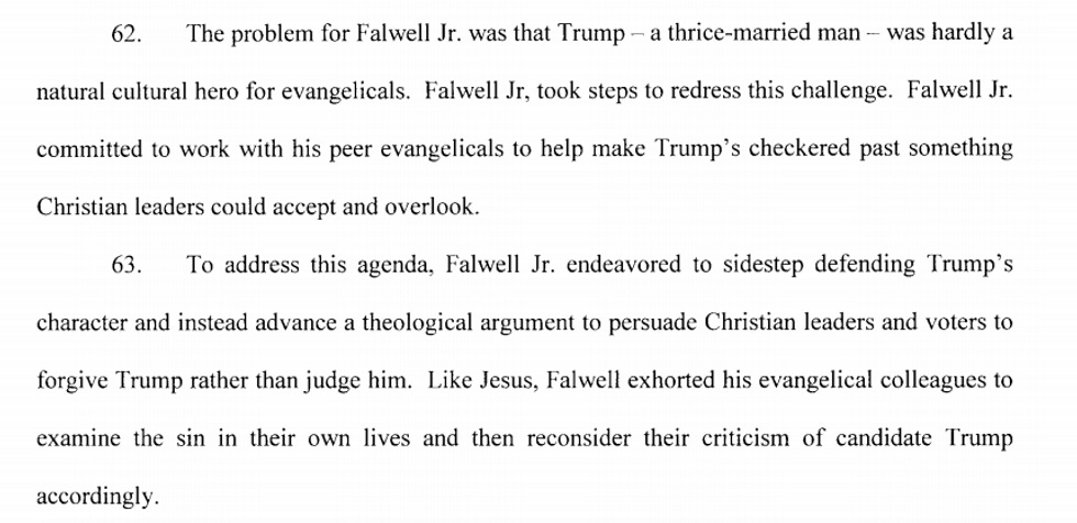 "Falwell Jr. planned to use his growing awareness of personal attack which he had encountered in honorable service raising Liberty's profile in his attempt to relax the severance policies in the President's existing contract," they write. And in case that's not clear enough, because huh?, the complaint contains several pages laying out all the ways Falwell maneuvered the university into going along with his endorsement of such a nasty, immoral person.