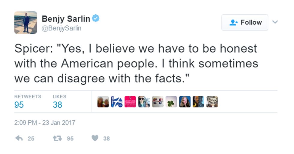 2: 10:They are trying to smooth over from Saturday HARDCORE. Given the opportunity to fact-check himself on his lies on Saturday, he is NOT doing so. He still claims more people ever watched the Trump inaugural than ever. He sees "no numbers that dispute that," because everybody was watching on their phone and their tablet.