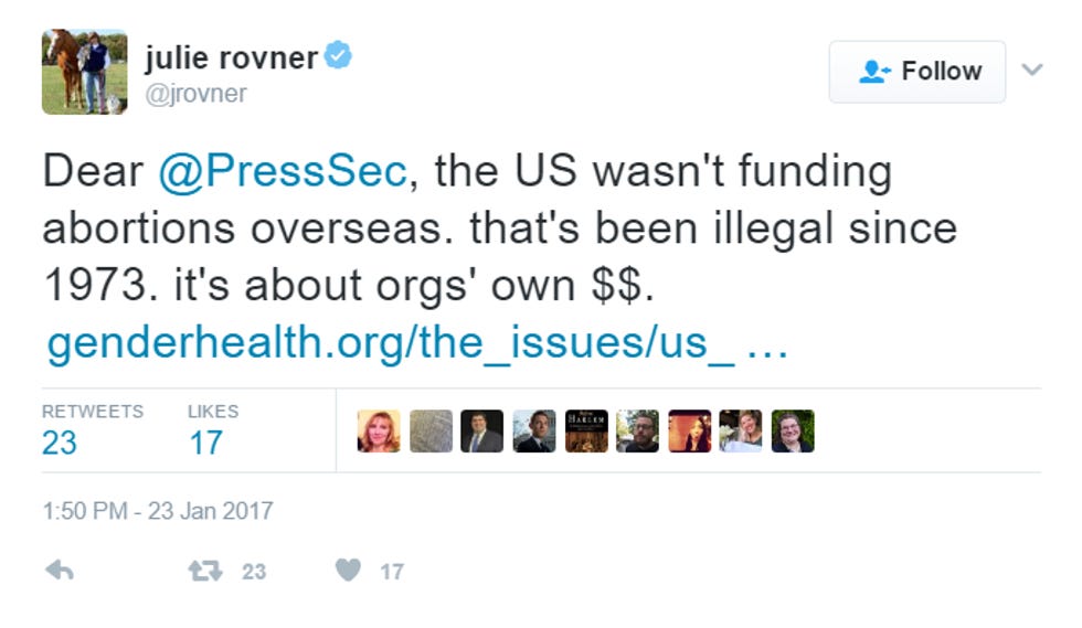 1: 48:Trump pulled us out of TPP, brought back Reagan's global gag rule on 'bortion funding, and other things. Spicer seems like he is trying to be nice. He emailed Bamz's press secretary Josh Earnest and said Earnest will stay the most popular press sec, because everybody thinks Spicer is a douche. #NOTFAKENEWS