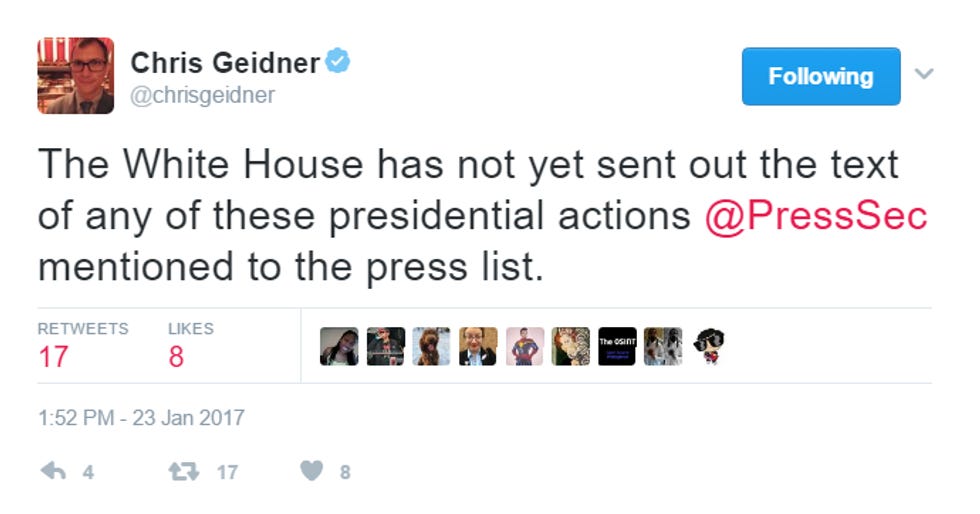 Also, lots of answers about "we dunno, it's our first day, like Kellyanne Conway hasn't even arranged her stuffed animals in her office and Jared Kushner is putting together his IKEA office furniture and cursing, none of us knew this was going to be a lot of work!"