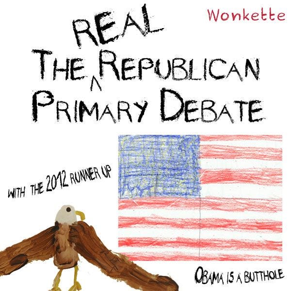 Well hello there! Are you ready to see the loser junior varsity Republican candidates lose some more while they debate each other during loser hour? US TOO! Who knows what's going to happen? Will Rick Santorum get real stigmata? Will Rick Perry comb his mane the whole time? Will Jim Gilmore try to feel Carly Fiorina on the boobies? Who can say, nobody knows who he is, so we don't know if he's a booby-grabbing creeper or not! Join us as we live-blog the inaugural debate of Fuckshow 2016!