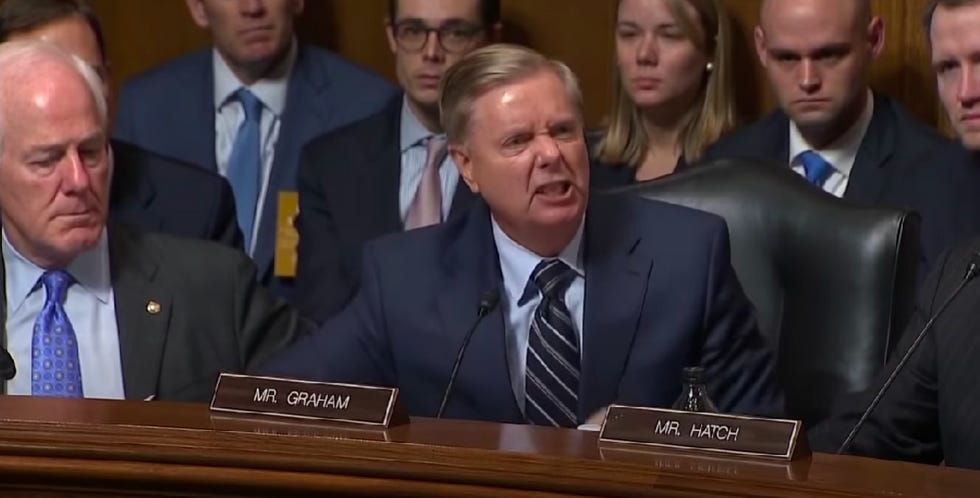 Quick, close your eyes and have a flashback to the confirmation hearings for Brett Kavanaugh. When you weren't seeing the Supreme Court nominee himself blubber and cry and whine and scream and wet his tighty whities about how unfair it was that all these people were totally credibly accusing him of sexual assault, Lindsey Graham was doing it.