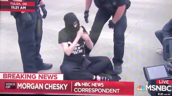 Sheila Buck of Tulsa, Oklahoma decided to go to the Trump rally today. Like other attendees, she had a ticket. Unlike other attendees, she was wearing a mask and a t-shirt that said "I can't breathe." She was there not to celebrate Trump, but to protest. Peacefully. She wore her shirt, she wore her mask and she sat on the ground, fairly far away from everyone else.