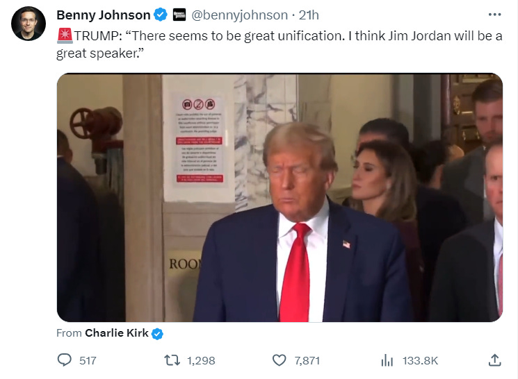 The signs of Jordan’s success were foretold when Donald Trump, that hollowed-out, crime-prone dildo, said outside his New York courtroom that there was about to be a “great unification” for Jimbo, who he referred to as a “young man.” (Jordan is 59.)