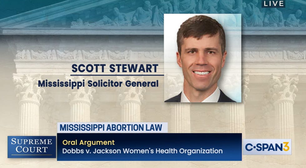 10: 02:We begin with Scott Stewart, solicitor general of Mississippi, who starts with some bullshit white man whining about how Roe has put some kind of dark stain on the Supreme Court.