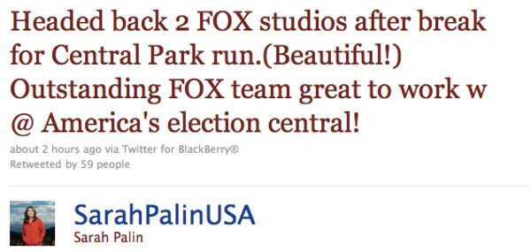 7: 29 PM — We have yet to see America's Political Analyst Sarah Palin, but apparently she has grown an additional beehive on her head.