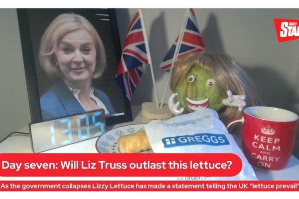 Also too, the Daily Star tabloid last week started a silly livestream on YouTube of a lettuce in a wig, asking whether it would last longer than Truss. While it browned a little, it's still standing, hours after Truss acknowledged she could no longer romaine in office and would leaf the government.
