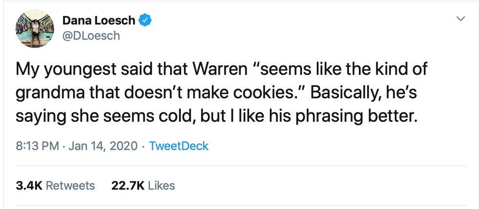 It's almost 30 years later, and Warren, who's not even running for first lady, is getting cookie smeared. Loesch equating a willingness to bake with personal warmth is sexist garbage. There are perfectly decent women who don't make cookies. That's why Girl Scouts exist. There's no corresponding domestic task that Loesch's child could apply to a male candidate. Does Joe Biden "seem like the kind of granddad who doesn't curse in front of the TV when his team loses the big game"? Does Bernie Sanders "seem like the kind of granddad who doesn't give his adult grandchildren $10 in cash for their birthdays"? We'll never know because no one asks such silly questions.