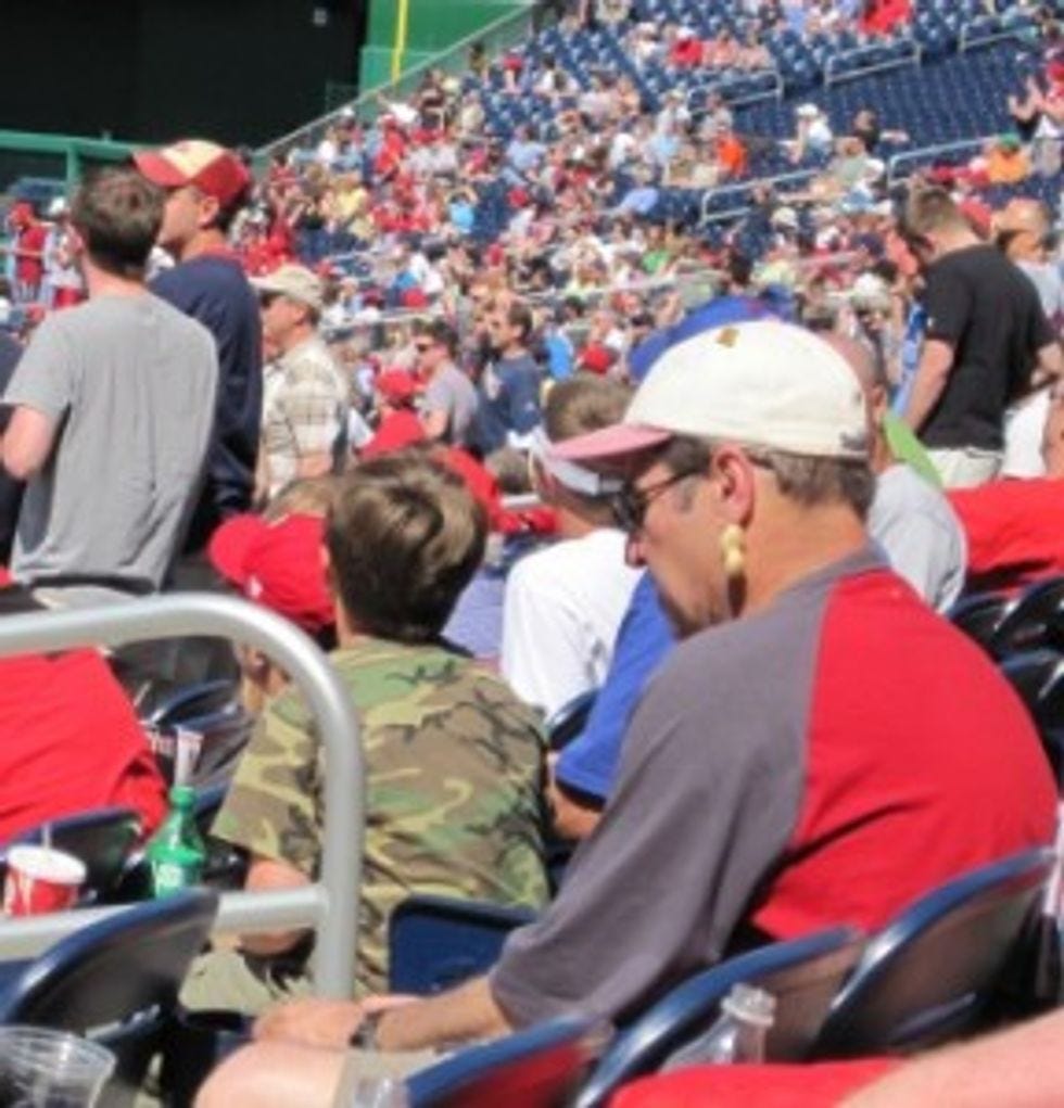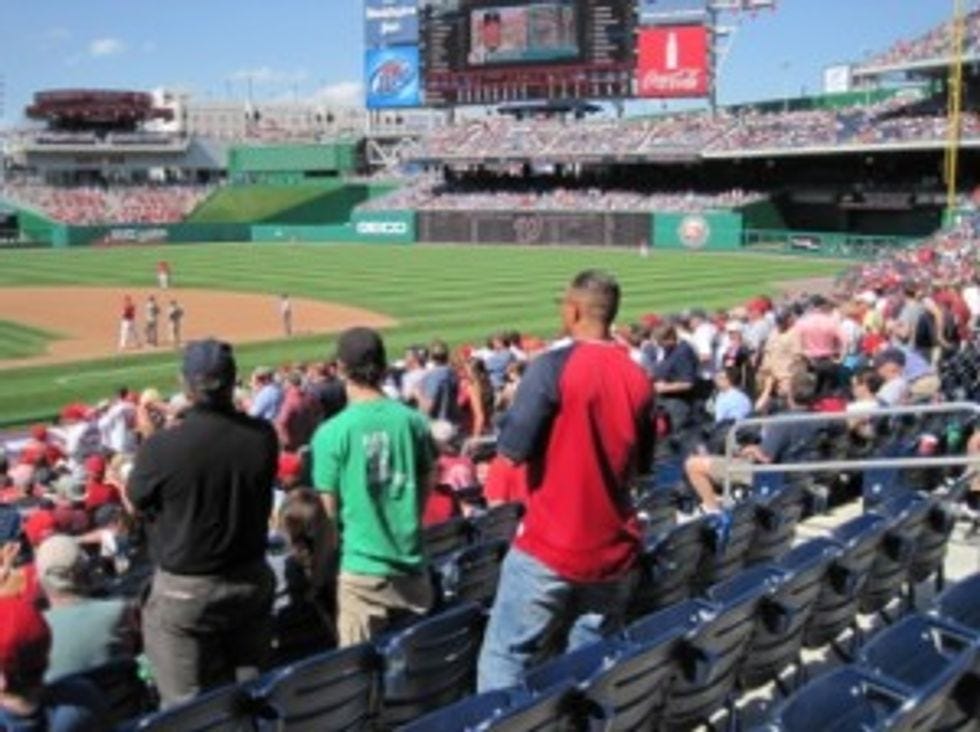 Look: Nats fans! See how they are not in their seats, but standing and cheering for the home team? And because everyone's expectations of the Nats are so low, Nats games are cheap! Tickets for decent seats are as cheap as $5 and, if one were to sneak into a more expensive section, which is rather easy to do, one may not be reprimanded for doing so. They WILL throw your ass out if you even think about putting your feet up.