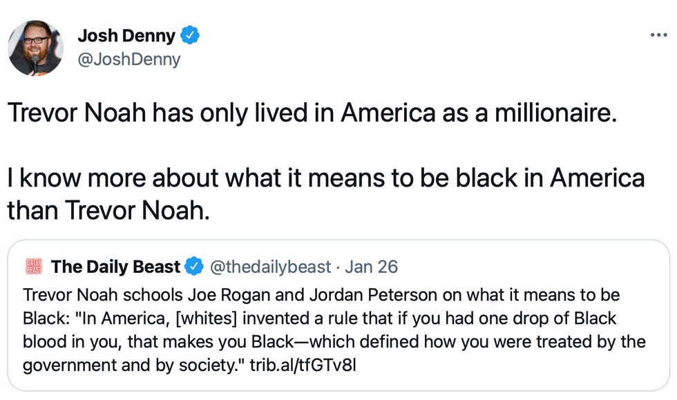 This weekend, supposed comedian Josh Denny — another clueless white man from America’s endless supply — tweeted: "Trevor Noah has only lived in America as a millionaire. I know more about what it means to be black in America than Trevor Noah.”