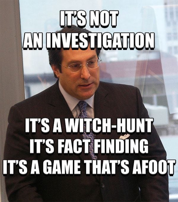 TRUMP IS NOT UNDER INVESTIGATION, so stop saying he's under investigation, even if you're literally quoting him word-for-word when he says he's being investigated. It's a witch hunt, but it's not a special investigative witch hunt -- don't you people watch Law and Order? Just listen to Kellyanne Conway!