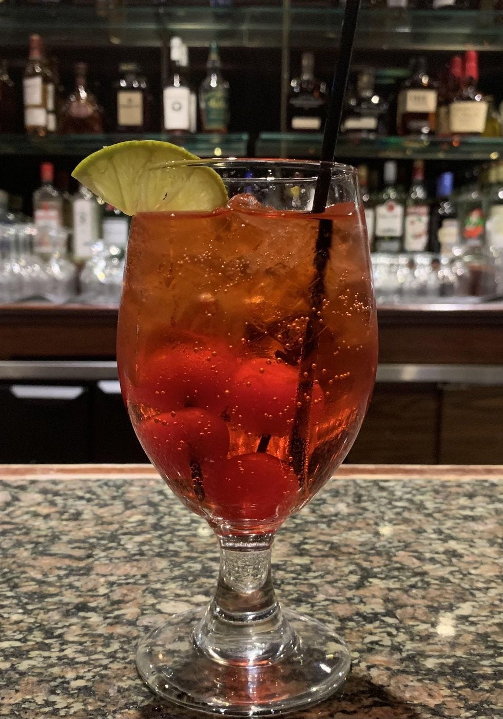 Pour grenadine into a highball or banquet goblet. Add ice. Top with soda water and lime juice. Garnish with at least 4 maraschino cherries and a lime wedge.