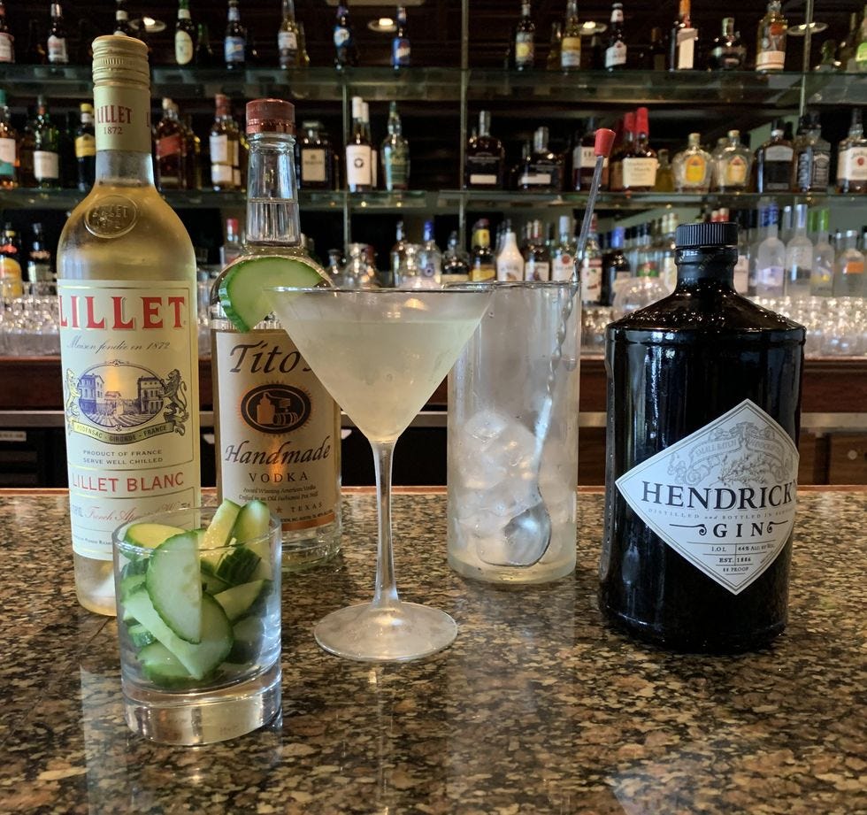 In a chilled mixing glass, add cucumber slices, gin, vodka, and Lilet Blanc. Gently muddle the cucumber slices. Add 3-4 ice cubes and stir 8-10 seconds. Strain into a chilled martini glass and garnish.