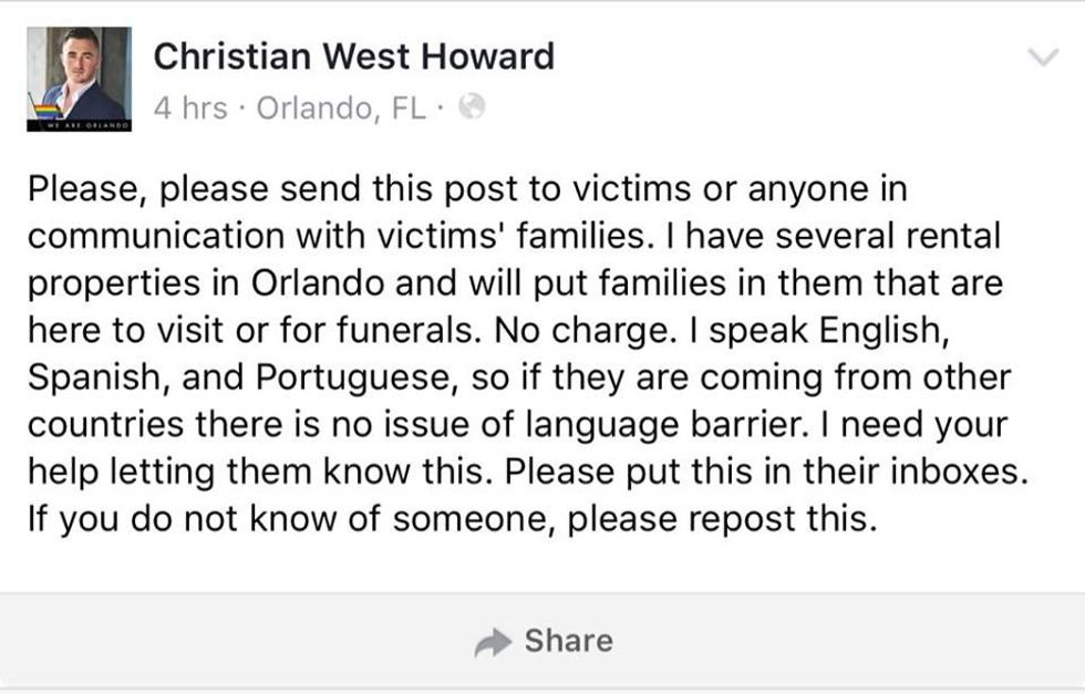 And how about this guy, a real estate agent in Orlando, who realized he had rental properties sitting around, and figured he'd offer them for free to any of the victims' families: