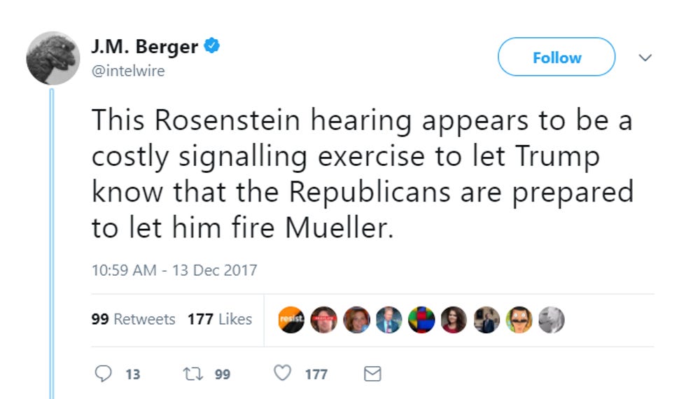 Watchers on Twitter agree with our assessment that this is just a big (and expensive!) show to convince Trump to try to fire Mueller:
