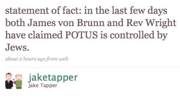 Look Guys, This Is A Fact, Just Sayin' It's A Fact; There Are Non-Facts But This Is A Fact, A Factual Item, It Denotes Real World Events, Objectively, As Facts Do, Because It Is A FactJim NewellJun 11, 2009ShareYes, there is a consensus, so it must be true. But who is to BLAME, Tapper? [ Twitter via The Awl ]Want to just donate once?PreviousNext