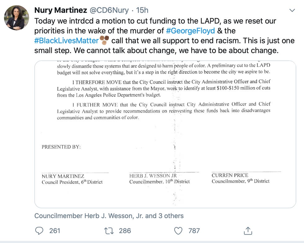 LA Police Commission President Eileen Decker declared that $100 million to $150 million of those cuts would come from the police department budget. L.A. City Council President Nury Martinez introduced the motion yesterday to reduce the LAPD's funding "as we reset our priorities in the wake of the murder of George Floyd." Yes, she said “murder."
