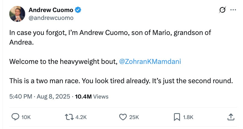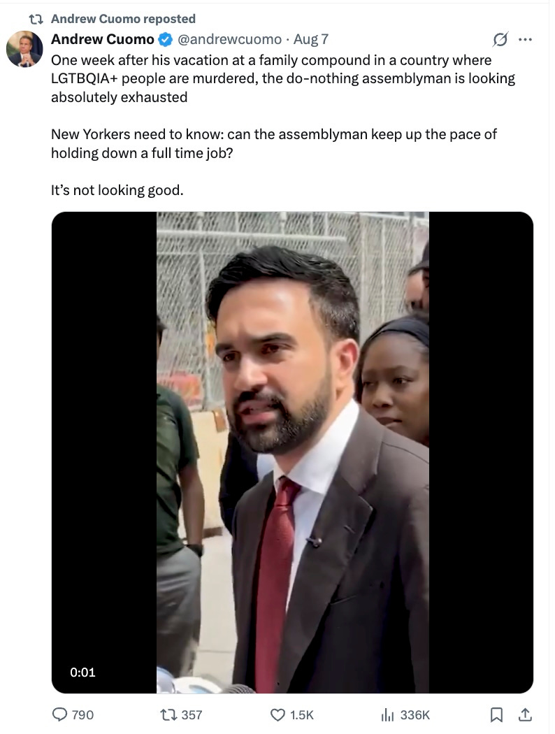 Cuomo’s line of attack on Thursday: that Zohran Mamdani is TOO TIRED TO BE MAYOR. Yes, 67-year-old Cuomo (or whoever is running his social media accounts) invited the reader to compare Cuomo’s leather-handbag liveliness and his formaldehyde pallor with that of Mamdani, a much more handsome man who is 33.