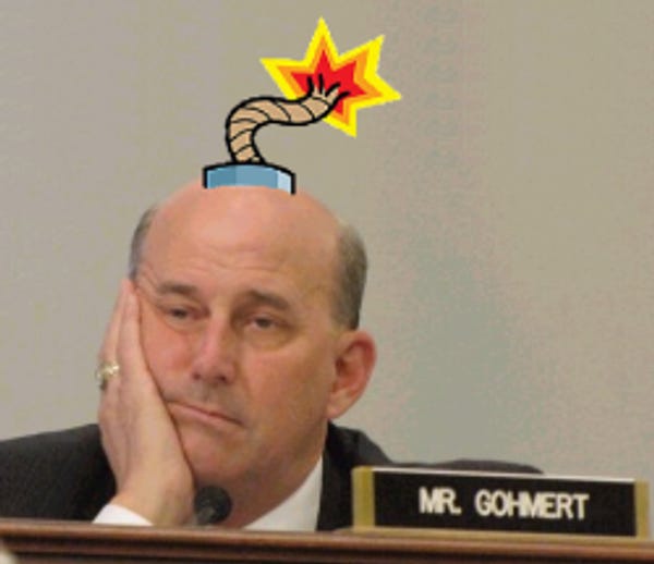 Texas Congressman Louie Gohmert (R-Lookatmee), clearly worried that he was no longer on the leading edge of crazed paranoia, suggested today that Attorney General Eric Holder allowed Boston bombing suspect Dzhokhar Tsarnaev to be read his Miranda rights not because Tsarnaev is a U.S. Citizen entitled to certain rights under the Constitution, but because Holder has a big throbbing stiffy for radical Islam. Holder also let the bombing happen because, in his extreme commitment to political correctness, he personally forbade the FBI from even asking Tamerlan Tsarnaev just how thoroughly Muslimy he was. Cool story, bro!