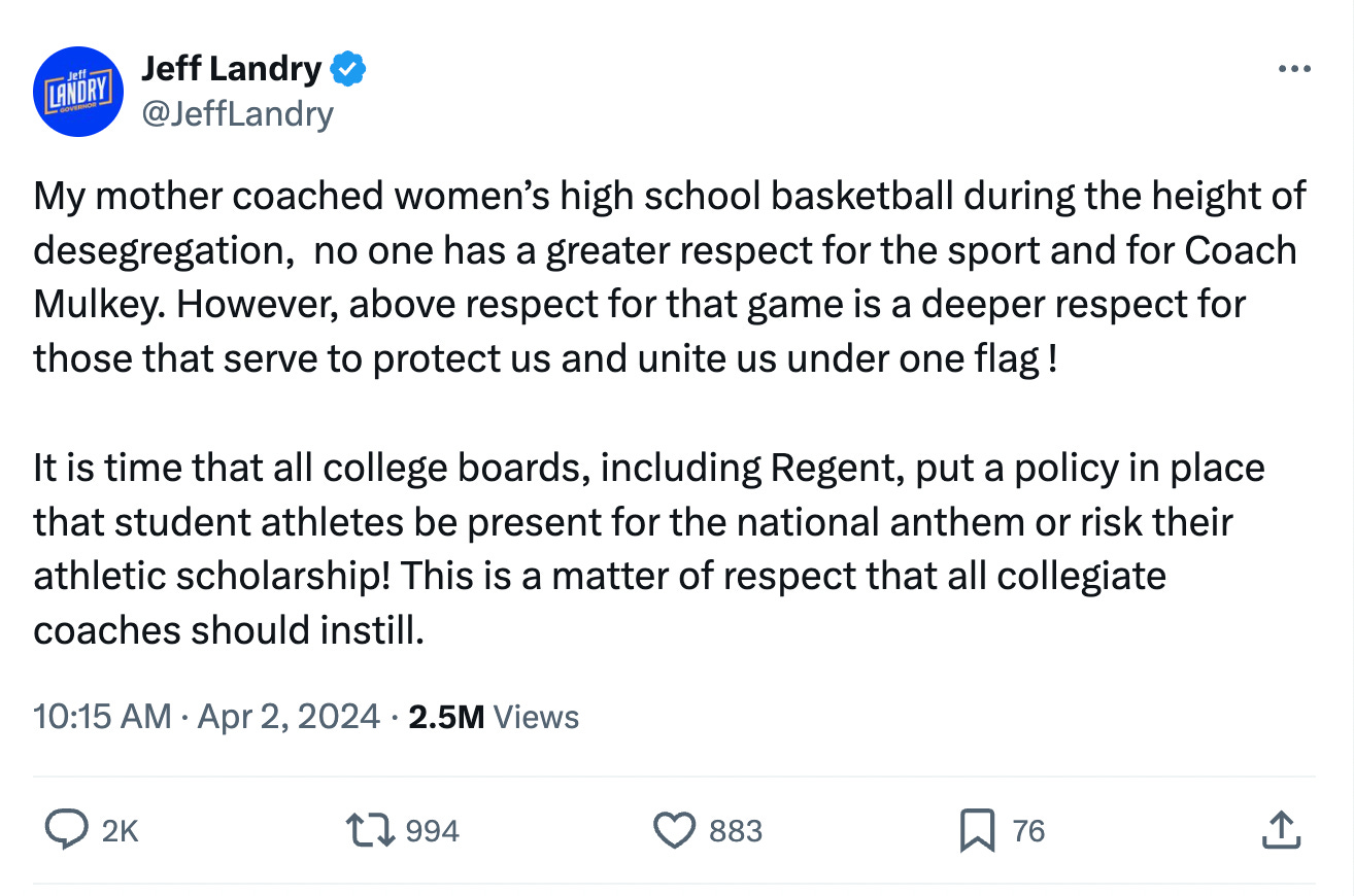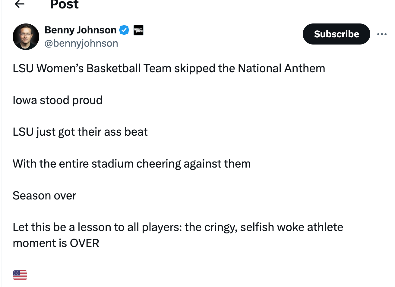 Not to mention that Kim Mulkey, the LSU coach, is a nasty MAGAt antivaxer and homophobe and about as unfuckingwoke as a human being can be.