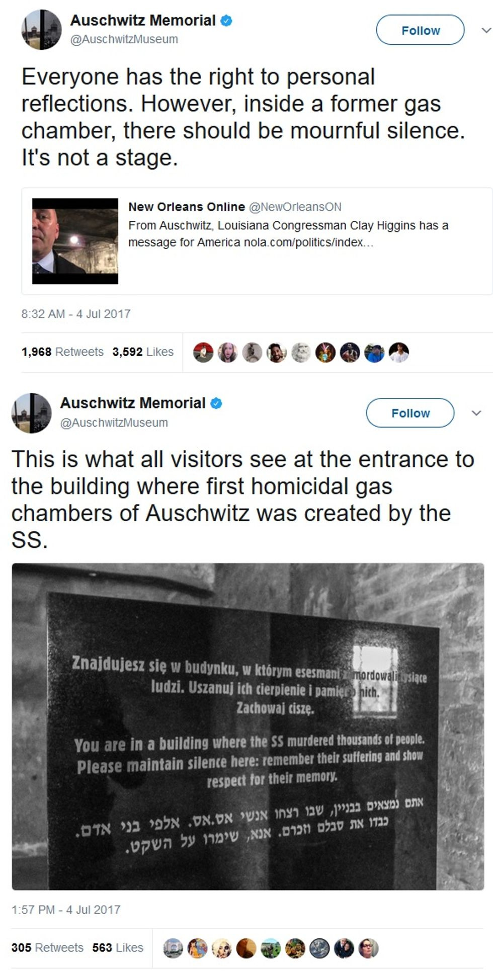 When he announced he was running for Congress last year, we worried that former police captain Clay Higgins, who became Internet Famous for his Tough Guy / come-to-Jesus Crimestoppers videos, might be out of his depth. Hoo boy, talk about an understatement. Since taking office in January, Rep. Higgins declared, following the London terror attack in June, that "All of Christendom … is at war with Islamic horror" and that the best answer to those suspected of involvement with Islamic terror is to "kill them. Kill them all. For the sake of all that is good and righteous. Kill them all." Then last week, just in time for Independence Day, Higgins made a video of himself wandering around the Auschwitz concentration camp in Poland and explaining why the Nazi program of genocide proves America needs to have a strong defense. The video, part of which was filmed inside a reconstructed gas chamber, was condemned by the Auschwitz-Birkenau Memorial and Museum. The museum's official Twitter account posted the criticism Tuesday, along with a photo of a sign asking visitors to be respectful of the site: