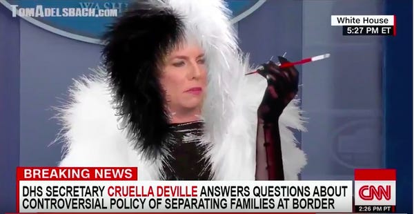 Still-evil but somewhat competent administrations might advise their Cabinet members not to chillax in fancy restaurants when their department is literally imprisoning children in refurbished Walmarts. It looks, I dunno, callous and stuff. I'm also concerned that she took a lesson from Scott Pruitt and chose a Mexican restaurant just so she could charge the dinner as a business expense.