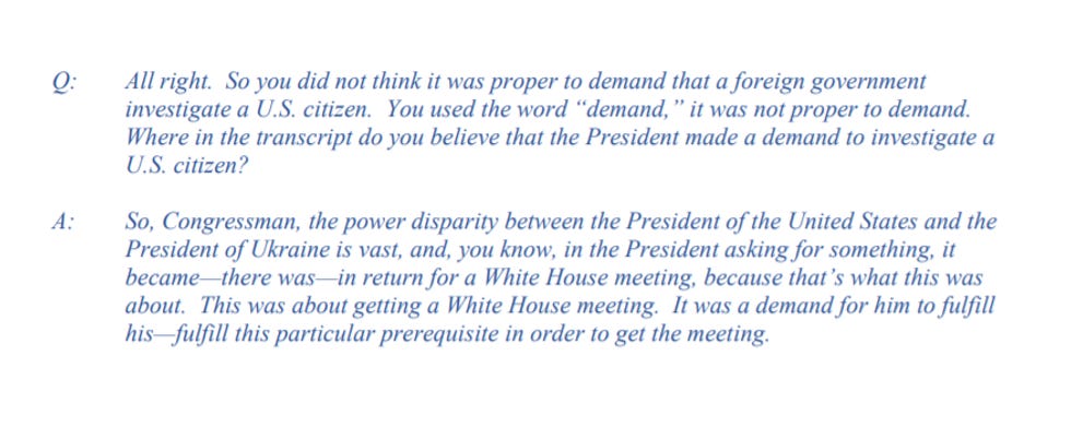 Q.All right. So you did not think it was proper to demand that a foreign government investigate a US citizen. You used the word "demand," it was not proper to demand. Where in the transcript do you believe that the President made a demand to investigate a US citizen?