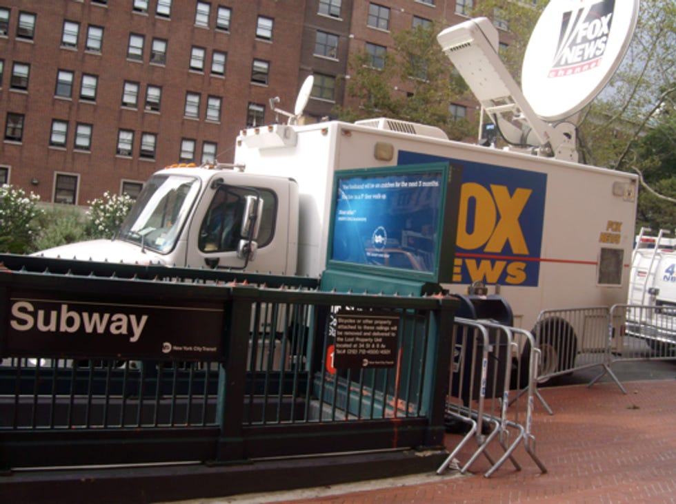 Fox News arrived late last night and parked illegally in front of the subway entrance. Major Garrett popped out of the van and stood under a giant umbrella. He is probably interviewing students right now about why Barack Obama is so ashamed to have gone to Columbia. But in fairness, Barack Obama is actually ashamed to have gone to Columbia. The presence of that flatscreen teevee will not impress him.