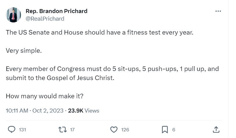 Every member of Congress must do 5 sit-ups, 5 push-ups, 1 pull up, and submit to the Gospel of Jesus Christ.
