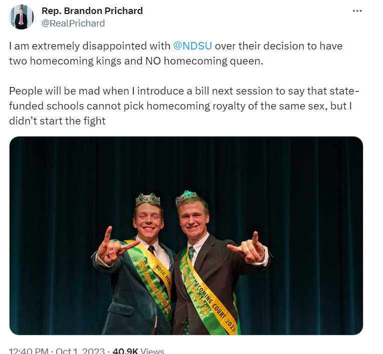 He’s super fucking upset that North Dakota State University recently voted on its homecoming royalty and picked two kings and no queen. But the little weenus isn’t upset because the homecoming court actually is gay — this happened because of the rules of how NDSU votes on its royalty — but because it looks gay. And he’s gonna make a law against it!