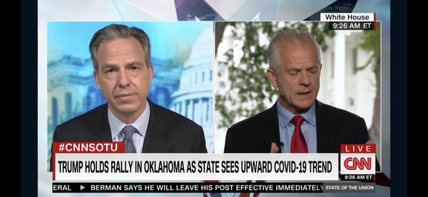Navarro appeared on CNN's "State Of The Union" with Jake Tapper, where Tapper asked him about Trump's failed Tulsa rally. Specifically one key moment: Trump "joking" about slowing down COVID-19 testing to help him politically.
